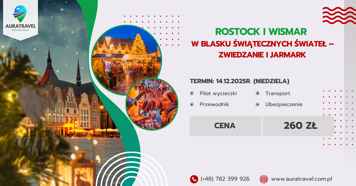 Zapraszamy na wyjątkową wycieczkę do malowniczych niemieckich miast – Rostocku i Wismaru, gdzie rozkwita prawdziwa magia świątecznych jarmarków. To idealna okazja, by poczuć klimat Bożego Narodzenia, spacerując wśród pachnących pierników, grzanego wina i kolorowych świateł. Czeka na Ciebie niezapomniana atmosfera, pełna radości, muzyki i zimowych atrakcji.