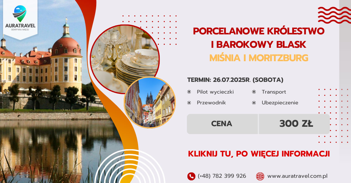 Wybierz się z nami na niezwykłą podróż do Miśni i Moritzburga, gdzie elegancja i historia splatają się w zachwycającą całość. Odkryj tajemnice słynnej miśnieńskiej porcelany i poczuj barokowy przepych w imponującym zamku Moritzburg. To wyjątkowa okazja, by zanurzyć się w świat piękna, tradycji i niezapomnianych wrażeń!